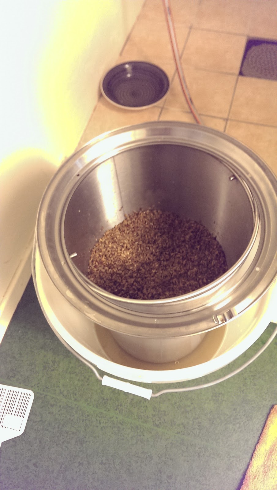 13:42 - Heller malten oppi og startet sirkulering med pumpe. Rørt om med en ren og lang trepinne. Pass på så det ikke renner over og utenfor silkaret. Da kan korn bli dratt med inn i sirkulasjonspumpa og tette filteret til pumpa.